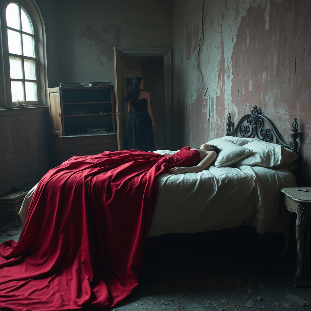 Abandoned crimson gown draped elegantly across a bed in a dilapidated post-apocalyptic setting, the room veiled in a layer of dust and wear, creating an unreal atmosphere, rendered in high-definition octane, showcasing every intricate detail of the scene, capturing the presence of a woman, her silhouette barely discernible, evoking mystery and intrigue.