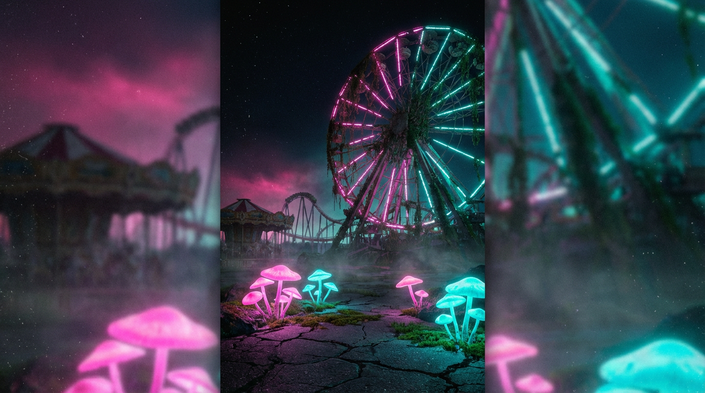 A moody night scene of a derelict amusement park, featuring a large Ferris wheel glowing with pink and teal lights, partially overgrown with vines. In the foreground, vibrant bioluminescent mushrooms sprout from cracked asphalt, adding an ethereal and mysterious atmosphere.