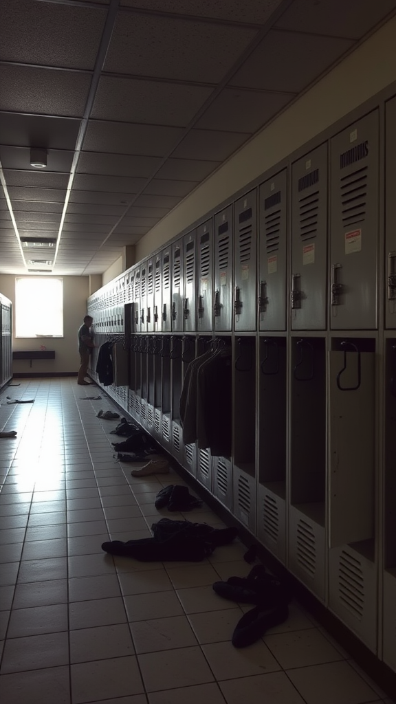 Abandoned locker room with rows of silent, open lockers and scattered hangers, the absence of people echoing softly against the tiled floor as dim, flickering lights cast long shadows.