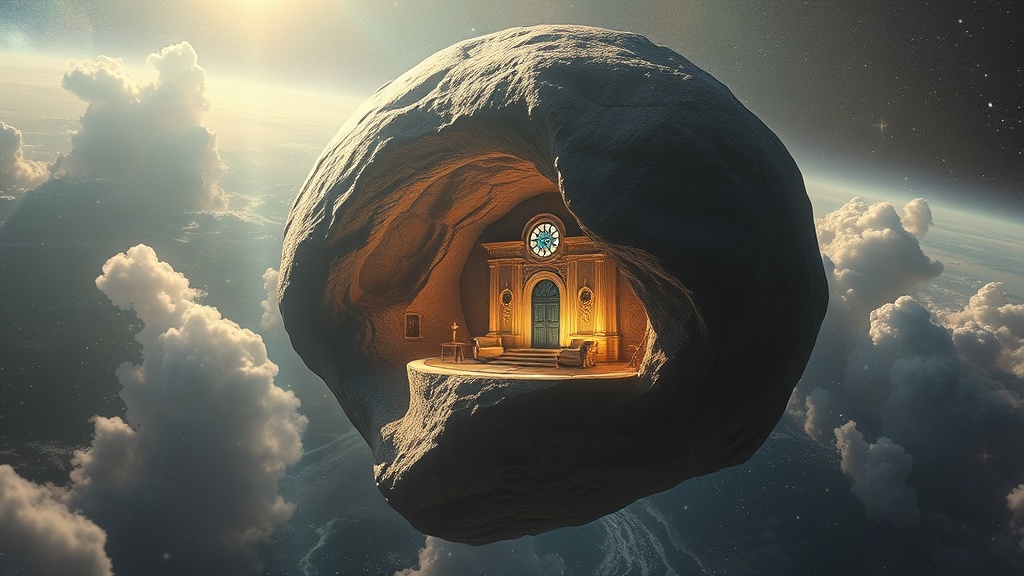 View this AI-generated image featuring a celestial abode sculpted within a colossal asteroid drifting through the ether evoking surreal dreamlike visions an ethereal harmony of cosmic wonder and artistic elegance leaving one in awe of its breathtaking beauty in an elongated vertical form. Created us
