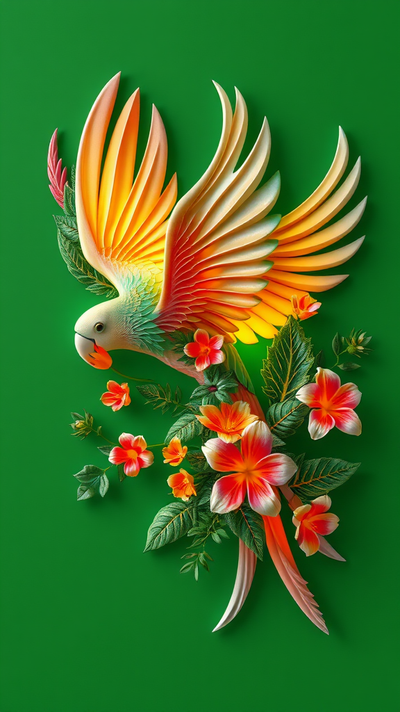 Abstract 3D form of a parrot soaring gracefully, interwoven with lush foliage and vibrant flowers, emitting a gentle glow, set against a rich emerald backdrop.