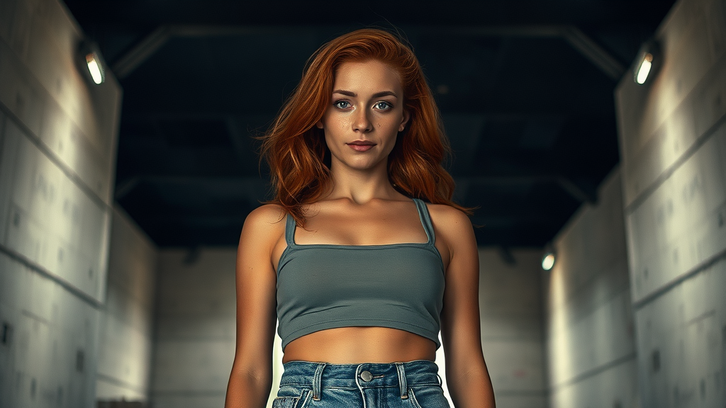 Abstract Brutalist high-fashion photo featuring a 24-year-old Chamorro-Venezuelan redheaded female with freckles, her expression radiating compassionate empathy. She wears a minimalist, concrete-inspired crop top paired with jeans showcasing exposed construction techniques. In the backdrop, heavy concrete fortifications loom, illuminated by moody, atmospheric lighting that accentuates board-formed concrete walls, evoking the enigmatic style of Olive Wollen. Her hair is styled in loose waves, adding a touch of natural elegance to the avant-garde setting.