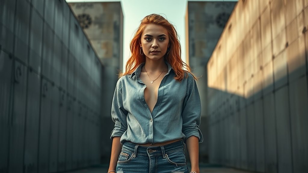 Abstract Brutalist high-fashion photo of a 24-year-old Chamorro-Venezuelan freckled redhead female showcasing a compassionate empathy expression. She wears a minimalist, concrete-textured shirt with an exposed midriff and deconstructed jeans featuring visible construction elements. The backdrop consists of imposing concrete fortifications under moody backlighting that casts dramatic shadows on the board-formed concrete walls, reminiscent of Olive Wollen's style.