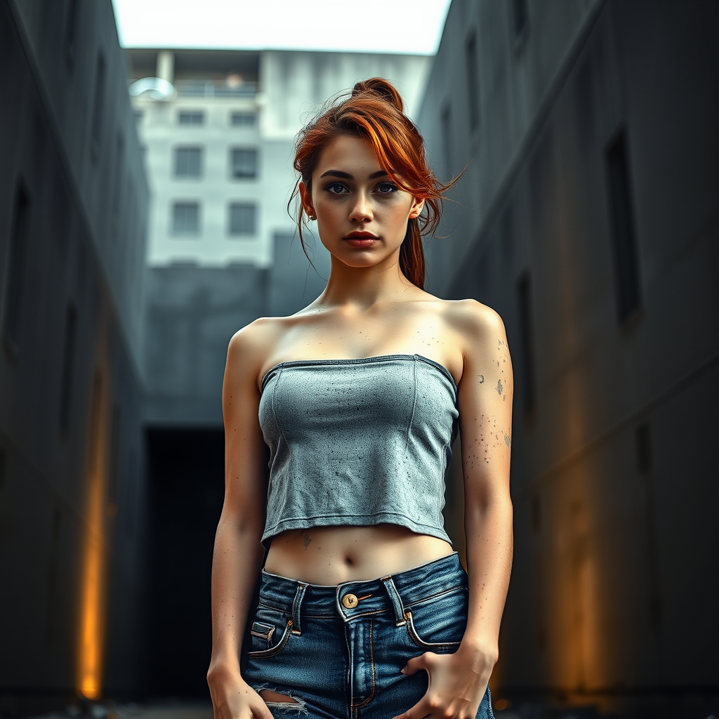 Abstract brutalist high fashion photograph featuring a 24-year-old Chamorro-Venezuelan female with freckled red hair, expressing compassionate empathy. She wears a minimalist concrete-textured crop top and jeans showcasing exposed construction elements. The background features imposing concrete fortifications with moody backlighting illuminating board-formed concrete walls, in the style of an Olive Wollen-inspired setting.