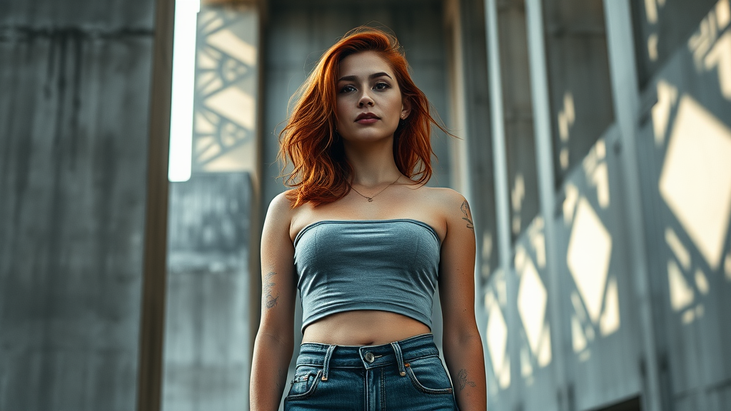 Abstract, Brutalist-inspired high fashion photograph capturing a 24-year-old Chamorro-Venezuelan woman with freckled red hair, radiating an empathetic, compassionate expression. She wears a minimalist, concrete-textured crop top paired with jeans that reveal exposed stitching and construction details. The backdrop features imposing, heavy concrete structures, with dramatic, moody backlighting casting intricate shadows on the board-formed concrete walls, evoking the enigmatic style of Olive Wollen.
