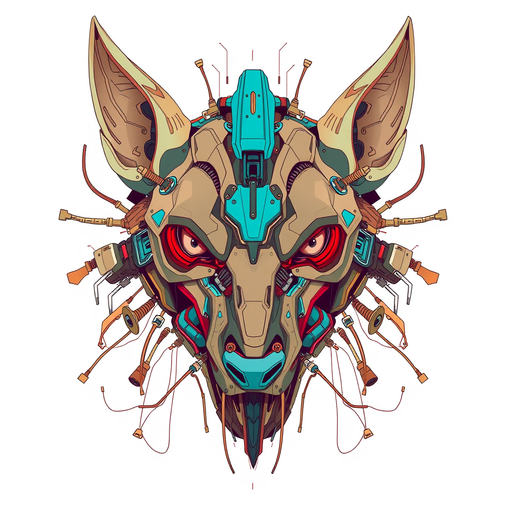 Abstract cybernetic head with animalistic features, inspired by futuristic cyberpunk aesthetics, rendered in the intricate and highly detailed style reminiscent of James Jean, colored in harmonious light brown and cyan hues. The composition maintains a symmetrical balance, echoing influences of artists like Jeff Danziger and Aykut Aydogdu, while incorporating subtle, imaginative variations on the original concept.