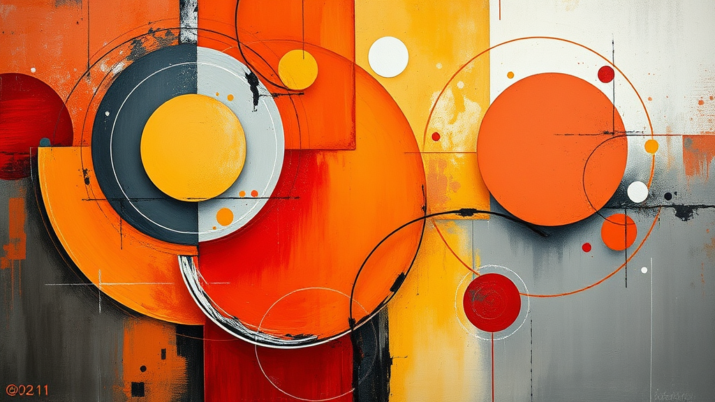 Abstract realism painting blending orange and grey hues with modern brush techniques, inspired by Bauhaus functional design, incorporating light yellow and deep red tones. Features circular shapes reminiscent of Dmitry Spiros, with elements of abstract sculpture, resulting in layered and intricate compositions. Embodies a masculine neo-cubism style, maintaining a unique interplay of geometric forms and vibrant color dynamics.