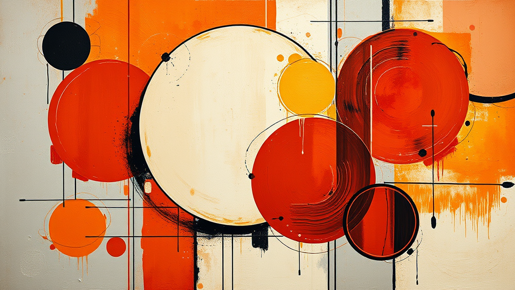 Abstract realism painting featuring a palette of orange and grey with modern brushwork, inspired by Bauhaus functional design. Incorporates light yellow and dark red hues with circular forms, drawing influence from the style of Dmitry Spiros. The piece includes elements of abstract sculpture, showcasing layered and intricate compositions. Embodies a masculine neo-cubism with a slightly altered focus on geometric harmony and balanced proportions.