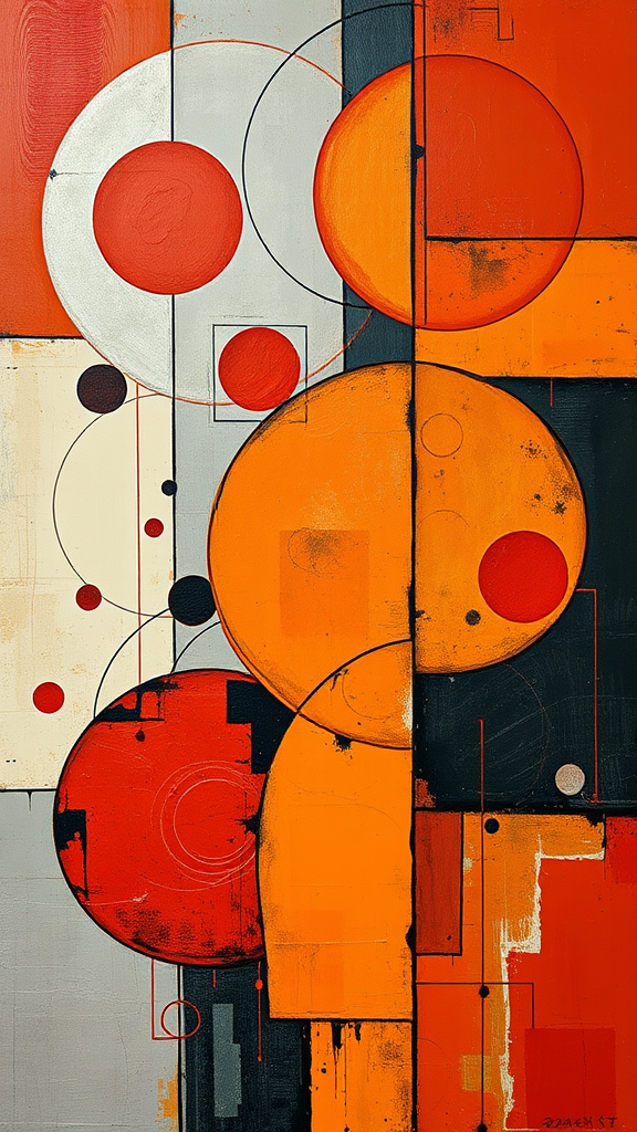 Abstract realism painting featuring a palette of orange, grey, and light yellow with modern brush techniques, influenced by Bauhaus functional design. Incorporating deep red hues and circular shapes, this piece channels the style of Dmitry Spiros with elements of abstract sculpture. The composition is layered and complex, embodying masculine neo-cubism, characterized by its bold geometric forms and intricate textures.