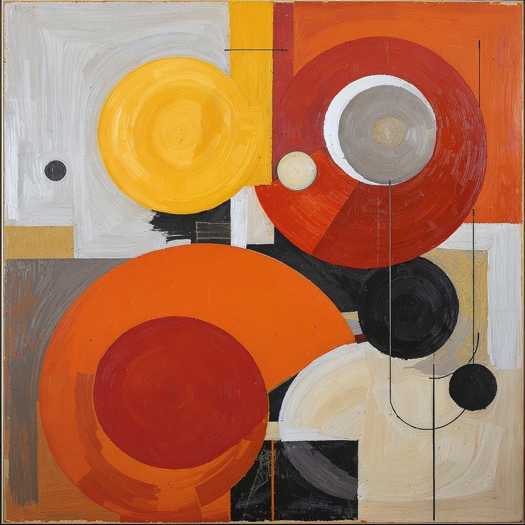 Abstract realism painting in orange and grey, featuring modern brush techniques, influenced by bauhaus functional design. Incorporates light yellow and deep red tones with circular shapes, in the style of Dmitry Spiros' abstract sculpture. The composition is layered and complex, with a masculine neo-cubism approach, maintaining an artistic ratio of 71:128 and emphasizing a highly stylized execution.