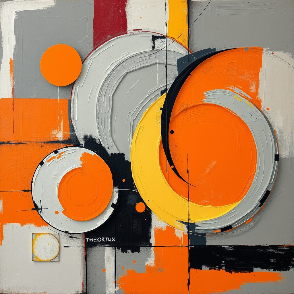 Abstract realism painting in orange and grey utilizing modern brush techniques, echoing Bauhaus functional design principles, with accents of light yellow and dark red. The composition features circular shapes, reminiscent of Dmitry Spiros' style, combined with abstract sculpture elements. The artwork boasts layered and complex compositions with an influence of masculine neo-cubism, maintaining an air of sophistication and innovation.