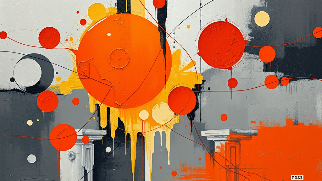 Abstract realism painting in orange and grey with contemporary brush techniques, influenced by Bauhaus functional design, incorporating light yellow and deep red hues with circular forms. The style evokes Dmitry Spiros, featuring abstract sculpture elements and intricate layered compositions, embodying a strong masculine neo-cubist aesthetic. Aspect ratio of 71:128, highly stylized with version 5.2 influences.