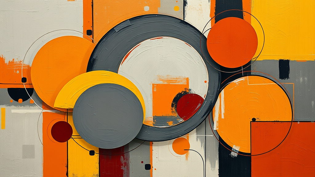 Abstract realism painting in orange, grey, and muted yellow, utilizing modern brush techniques and reflecting Bauhaus functional design principles, enhanced by dark red accents. Features circular and geometric shapes, reminiscent of Dmitry Spiros' work, with abstract sculptural qualities. The composition is layered and complex, echoing masculine neo-cubism elements, presented in a unique 71:128 aspect ratio with a high degree of stylization.
