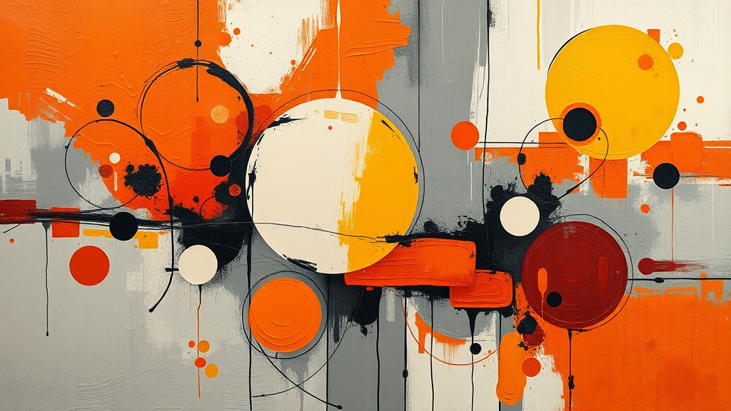 Abstract realism painting in shades of orange and grey, featuring modern brush techniques inspired by Bauhaus functional design, with accents of light yellow and deep red. Incorporates circular shapes and draws influence from Dmitry Spiros, alongside elements of abstract sculpture. The composition is layered and complex, reflecting a masculine neo-cubist aesthetic, enhanced by a stylized approach with an aspect ratio of 71:128 to emphasize verticality.