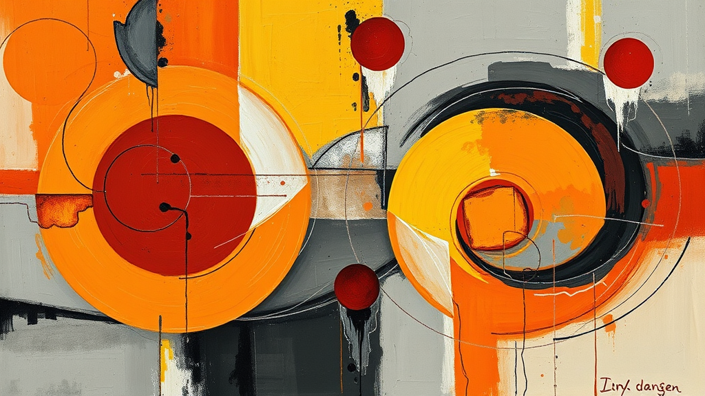 Abstract realism painting in shades of orange and grey, infused with modern brush techniques and inspired by Bauhaus functional design. Incorporating light yellow and dark red hues, the composition features dynamic circular shapes reminiscent of Dmitry Spiros's style. The piece exudes a sense of abstract sculpture with layered and intricate compositions, embracing a masculine neo-cubism influence. The creation is characterized by its structured yet fluid aesthetic, harmoniously blending geometric forms and organic movement.