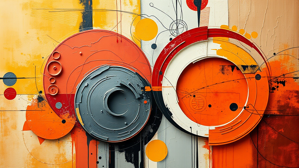 Abstract realism painting in shades of orange and grey, incorporating contemporary brush techniques, inspired by Bauhaus functional design. Features hues of light yellow and deep red, with prominent circular shapes and the influence of Dmitry Spiros. The composition echoes abstract sculpture with layered, intricate details, and exhibits a masculine neo-cubism style. The aspect ratio is 71:128, showcasing a harmonious blend of geometry and abstraction, all encapsulated in a sophisticated and dynamic visual language.