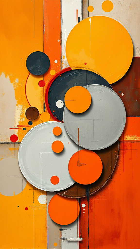 Abstract realism painting in shades of orange and grey utilizing contemporary brush techniques, inspired by Bauhaus functional design with hints of light yellow and deep red. Featuring circular forms reminiscent of Dmitry Spiros' abstract sculpture, the composition is layered and intricate, echoing a masculine neo-cubist style with a unique twist. The design emphasizes balance and innovation in a vertically oriented composition embodying a sense of dynamic complexity.