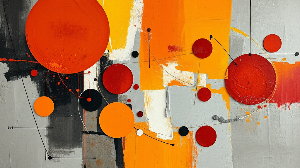 Abstract realism painting in warm hues of orange and grey featuring modern brush techniques, inspired by Bauhaus functional design. Incorporates light yellow and deep red tones with circular motifs, reminiscent of the style of Dmitry Spiros. Blends elements of abstract sculpture, showcasing layered and intricate compositions with a masculine neo-cubist influence, emphasizing dynamic forms and a meticulously structured aesthetic.