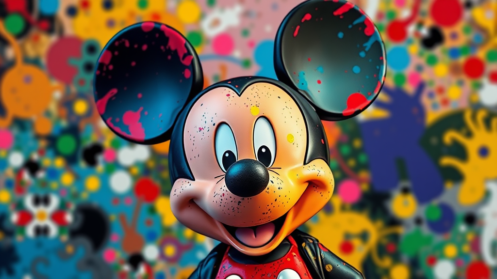 Abstract reimagining of Mickey Mouse in vivid hues, set against a Jackson Pollock-style background, complete with a full image splash; envisioned for MoMA magazine, expressive and untamed, blending high art with impressionism. Utilizing a 3D model crafted in Maya, featuring a color-spattered visage and form, captured in high-resolution texture, 4k. This piece is akin to an award-winning photograph, as if sourced from Pixabay, radiating emotion and creativity.
