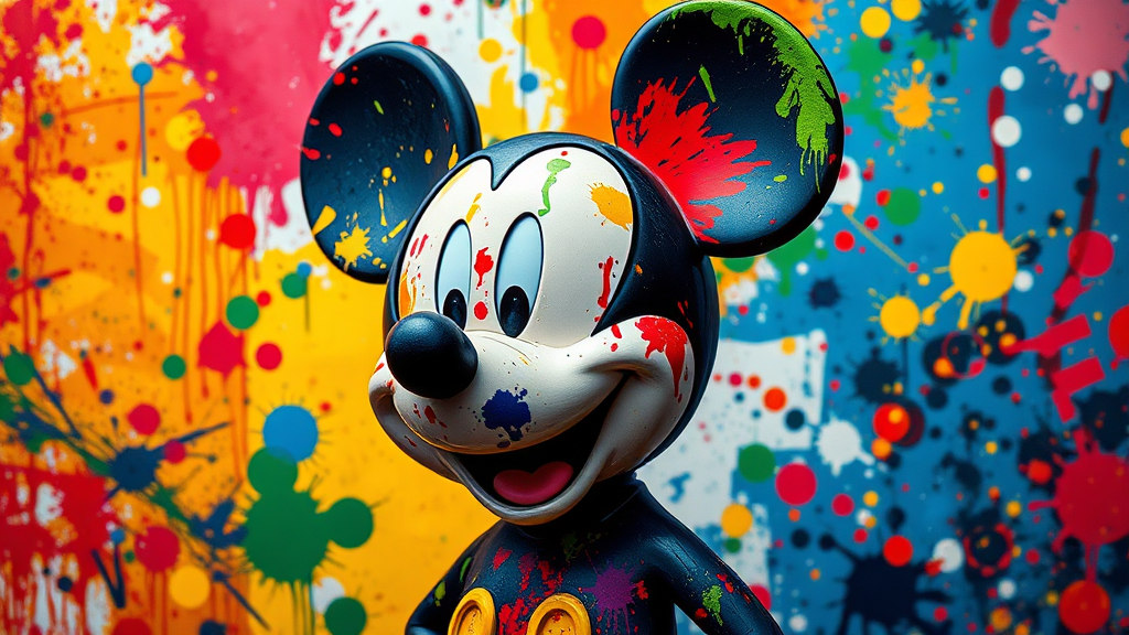 Abstract reinterpretation of Mickey Mouse in a riot of vibrant colors, set against a Jackson Pollock-inspired backdrop, with dynamic splashes across the entire image. Suitable for a feature in an art publication, capturing wild emotions and high art sensibilities. Infuse a touch of impressionism with a 3D model crafted in Maya, showcasing a color-splattered face and body with high-resolution texture. Rendered in 4k quality, this professional piece of photography echoes award-winning artworks.