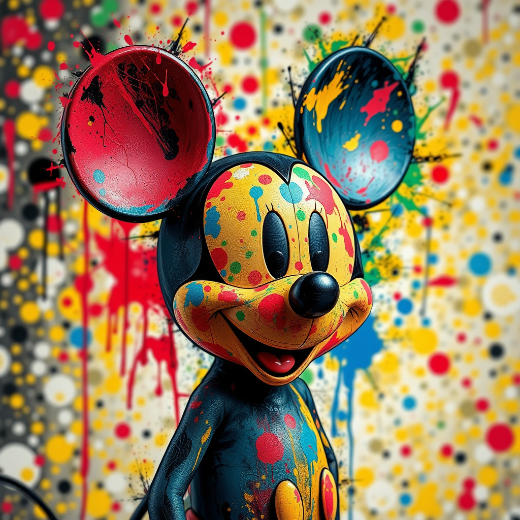 Abstract reinterpretation of Mickey Mouse with vivid colors, set against a Jackson Pollock-inspired backdrop, creating a full-image splash. Imagine this featured in MoMA magazine, capturing the wild, emotional essence of high art with impressionistic flair. Envision a 3D model crafted in Maya, showcasing a color-spattered face and body with high-resolution texture. This 4k professional photograph, reminiscent of award-winning artwork, offers a captivating, expressive view suitable for a gallery.