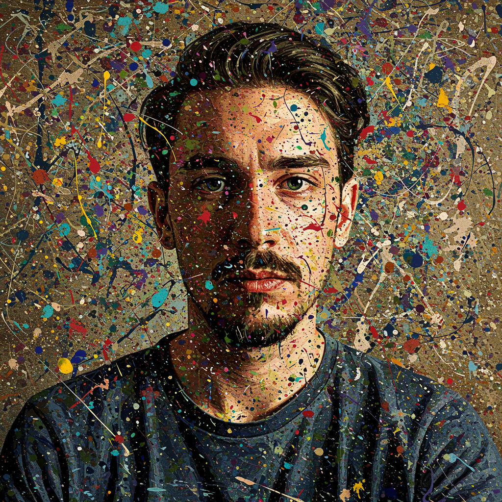 Abstract self-portrait channeling the essence of Jackson Pollock, capturing the dynamic chaos and energy of swirling colors and spontaneous paint splatters, reflecting an inner world teeming with creativity and raw emotion, each drip and stroke narrating fragments of an untamed artistic soul.