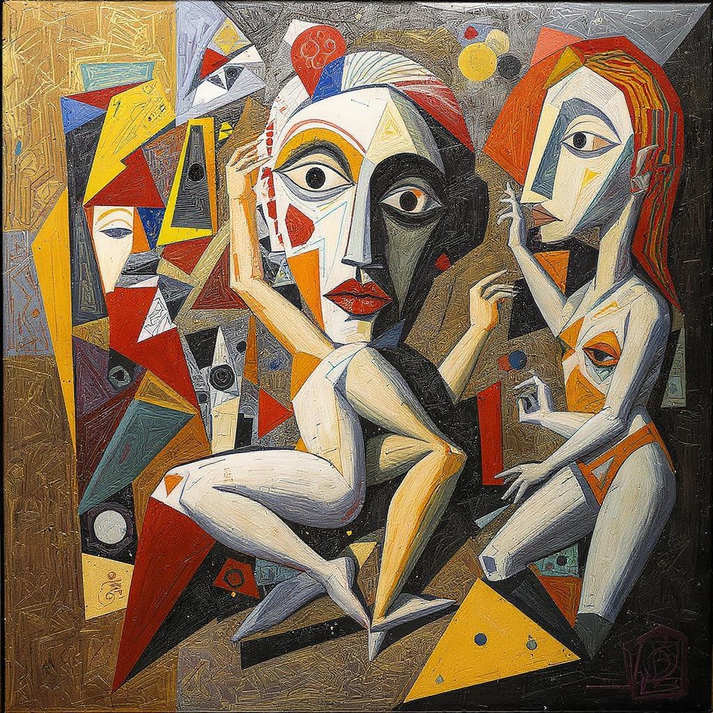Abstract surrealism evoking the essence of Picasso, characterized by vivid colors and bold angular shapes intertwined in a dreamlike tapestry. A symphony of distorted forms and playful geometry creates an otherworldly scene, where fragmented faces and disjointed limbs dance in harmonious chaos. The atmosphere is charged with dynamic energy, a fusion of imagination and reality that floats between the realms of the known and the subconscious. The elongated composition stretches upwards, inviting the viewer into a vertical exploration of whimsical elements and curious juxtapositions, embodying a stylized vision of creative freedom.