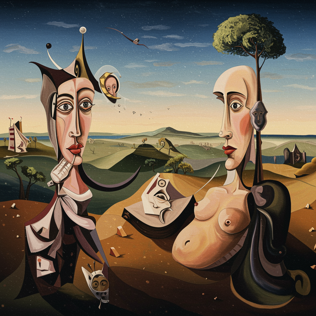 Abstract surrealism in the style of Picasso, featuring a dreamlike landscape with distorted shapes and vivid colors, where reality bends into the extraordinary, infused with a sense of controlled chaos, elongated forms, and fragmented faces merging into a flowing tapestry, revealing the interplay between imagination and reality with a whimsical yet introspective mood, capturing the essence of emotional depth and complexity.