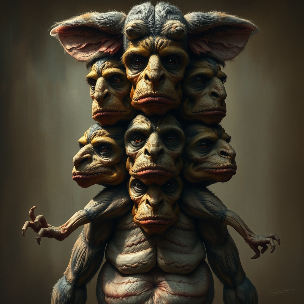 Absurd resolution, detailed facial expressions, intricate painting style, cinematic feel, dim natural lighting, vivid depiction of animals, HDR quality, stacked torsos resembling a totem pole, intentionally exaggerated features, unusual anatomy with extra or missing limbs, floating and disconnected limbs, elements of distortion and mutation, creating an unsettling and surreal appearance, with an emphasis on blurry and abstract details.