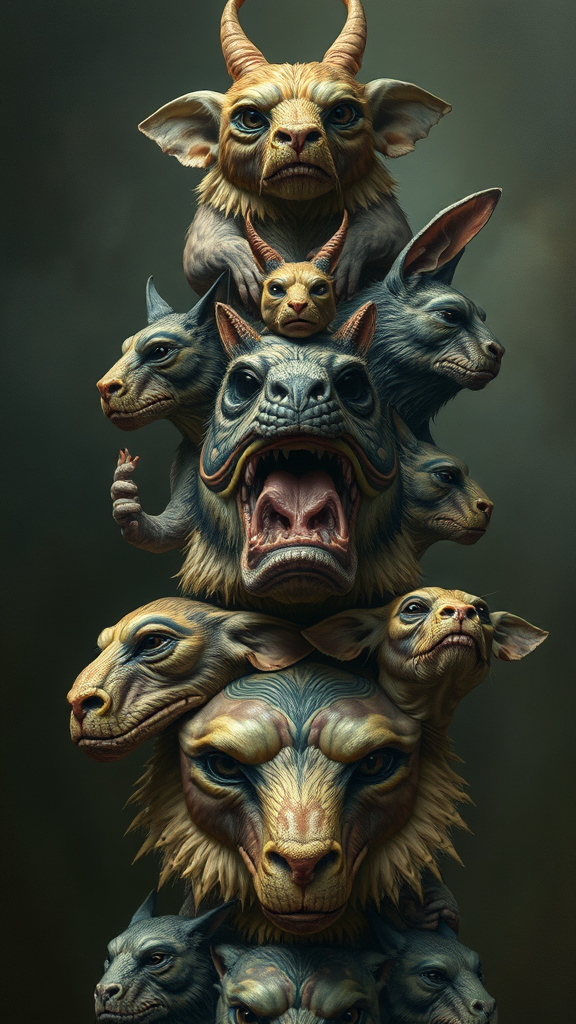 Absurdly detailed faces, intricate and cinematic with dim natural lighting, features a painting of animals stacked like a totem pole, showcasing quirky anatomy. Some elements may feature floating or disconnected limbs, with a hint of mutation creating an unusual yet fascinating composition, blending HDR effects with an intentionally surreal and distorted style.