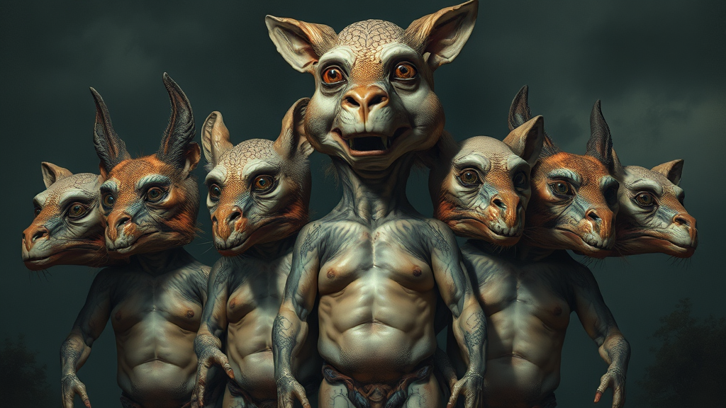 Absurdly detailed faces with intricate features, a cinematic painting with dim natural lighting, depicting a totem pole of animals with stacked torsos, showcasing unusual anatomy, with extra, missing, or floating limbs; a surreal and mutated scene, with grotesque yet captivating beauty amidst HDR effects. Elements appear disconnected, with a touch of artistic distortion creating a unique blend of realism and abstract.