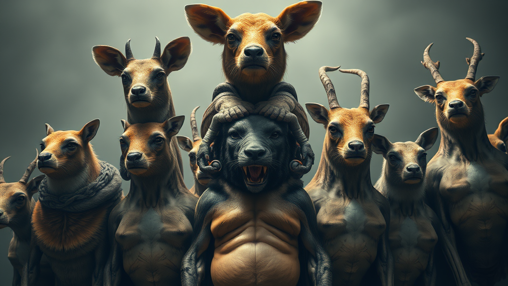 Absurdly high-resolution, vibrant and intricate depiction of animals in a cinematic painting, showcasing detailed faces in dim natural lighting, invoking a sense of HDR realism. The composition features a surreal totem pole of stacked torsos, with an unsettling mix of poorly rendered anatomy, including extra and missing limbs, floating and disconnected parts, creating a mutated, blurry and unsettling visual. The image evokes a sense of beauty and ugliness intertwined, pushing boundaries of traditional aesthetics with creative distortions.
