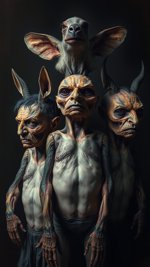Absurdres, detailed faces, dim natural lighting, intricate and detailed painting, cinematic atmosphere, HDR effect, animals depicted with unique and distorted anatomy, featuring stacked torsos resembling a totem pole, showcasing poorly drawn and mutated features with extra and missing limbs, floating and disconnected limbs creating a sense of mutation, resulting in an ugly and disgustingly blurry appearance, incorporating elements of amputation and unnatural formations.