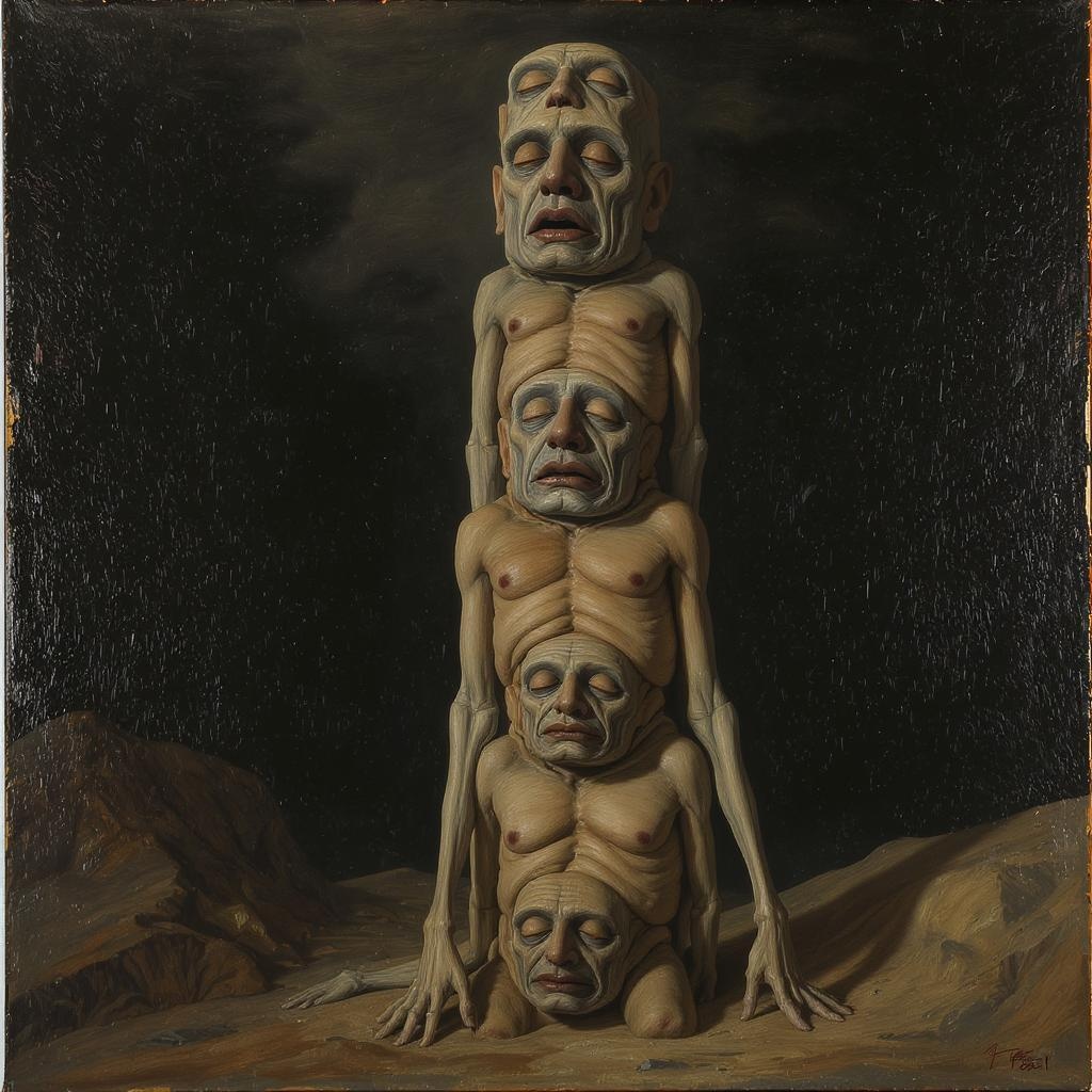 Absurdres detailed faces intricate cinematic dim natural lighting animals detailed painting clearly worked out detail HDR stacked torsos totem pole surreal anatomy extra limbs missing limbs floating limbs disconnected limbs mutation mutated abstract distorted blurry creative reimagining fantastical elements imaginative composition unique fusion