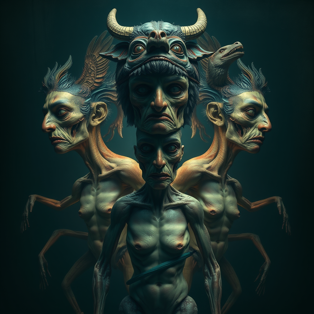 Absurdres, detailed faces, intricate painting, cinematic, dim natural lighting, HDR, animals, stacked torsos totem pole, exaggerated anatomy, surreal, floating limbs, disconnected elements, mutated forms, bizarre, abstract, blurred lines, mutations, grotesque, dreamlike, imaginative distortion, unsettling beauty, artistic imperfection.