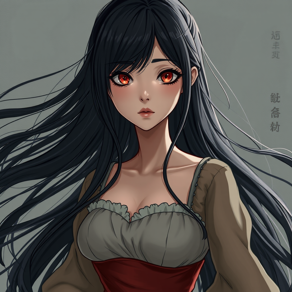 Absurdres photorealist ultra detailed 8k uhd solo contemplative red eyes medieval dress flawless physique flowing black hair medium bust sheer fabric 3d realism cartoon anime sketch elements cinematic frame narrative atmospheric nuances storytelling visual title intricate hand detail