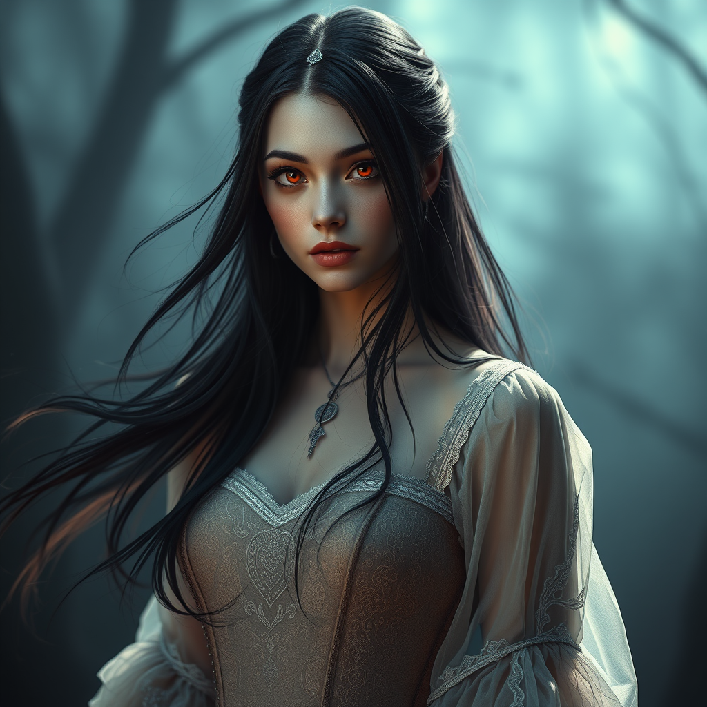 Absurdres photorealistic highres ultra detailed 8k UHD solo melancholy expression red eyes medieval gown flawless figure flowing black hair medium bust ethereal see-through fabric intricate embroidery atmospheric lighting single character fantasy setting delicate composition no text or signature