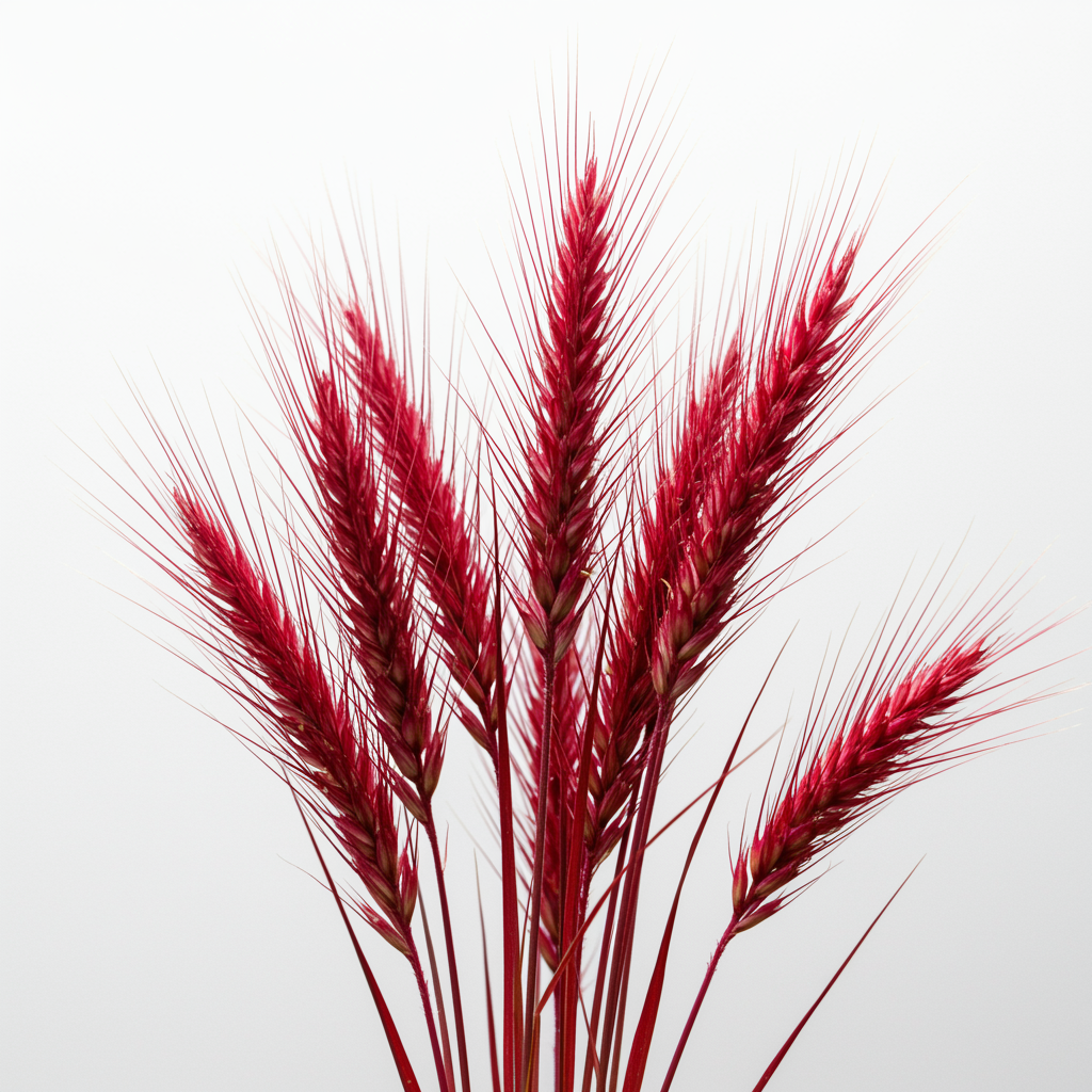 Acclaimed minimalistic photograph showcasing crimson spikelets against a pristine white backdrop, with subtle creative twists enhancing the core essence.