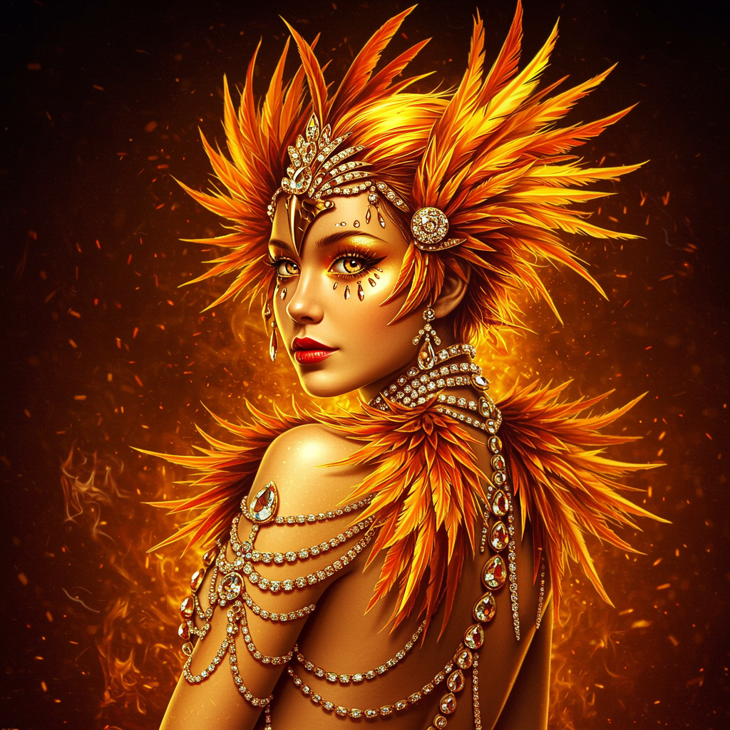 Acid lighting, emanating from below, casts a hyper-realistic and intricately detailed portrait of a Firebird girl, merging elements of gold and fire. Her hypnotic expression and fractal hair and feathers dance in surrealism. With an enigmatic, flirty smile and viewed from behind, she is adorned in a complex chaotic diamond outfit. Reflective eyes draw you in, surrounded by detailed Art Deco ornamentation. Inspired by the works of Bayard Wu, Yann Dalon, and others, she embodies an inquisitive soul. Her image is defined by gold hues, intricate detailing, and a touch of artificial nightmare style, all while avoiding any disfigurement, blur, abstraction, cartoonish features, or anatomical errors. The composition maintains harmonious proportions and clear focus, creating an exceptional piece of art.
