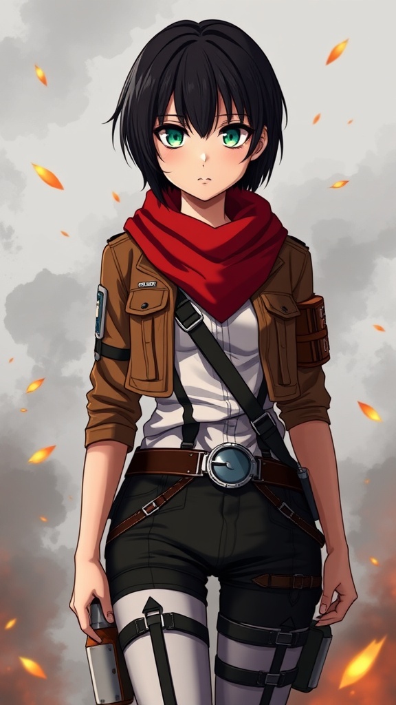 In the style of Attack on Titan, featuring a depiction of Mikasa Ackerman with her characteristic arm strap, black hair, and bangs. She is wearing black pants and a brown jacket over a white shirt, embodying the essence of the Survey Corps. The scene captures her in a cowboy shot that highlights her medium build and green eyes, with a red scarf draped around her neck. Embers float around her against a smoky, grey background, and her short hair falls gently between her eyes. A harness and thigh strap add to her battle-ready look. Drawn in a high-quality 3D cartoon anime style, displaying subtle skin texture for realism, and avoiding exaggerated features like large breasts or male muscular build, instead focusing on her determined expression as she gazes confidently at the viewer.