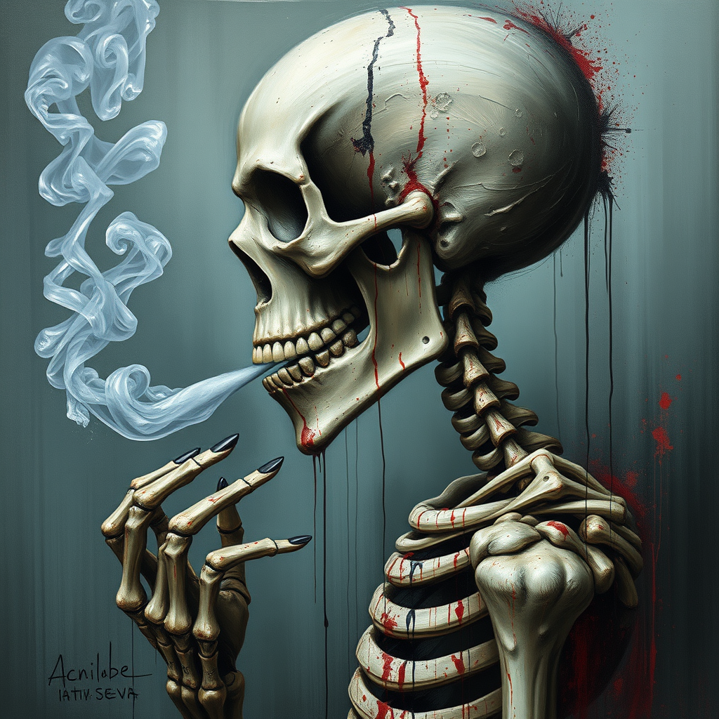 Acrylic painting featuring a side view portrait of a smoking skeleton, utilizing splatter and drip techniques to evoke a sense of gloom and drama. The composition is epic, with an expressionist style that captures a close-up, emotionally profound essence. Inspired by the works of Tanya Shatseva, the digital painting conveys a morbid and haunting atmosphere. The depiction includes elements of poor quality and distortion, with visible jpeg artifacts and deliberately flawed aspects such as poorly drawn hands and face, mutations, and deformed features. The anatomy and proportions are intentionally disrupted, presenting extra and malformed limbs, a long neck, and a dehydrated appearance. Despite the subverted artistic quality, the piece remains striking, with hints of duplicated or cloned features. The presence of camera artifacts, signatures, or logos is minimized, preserving the raw, unpolished aesthetic of the work.