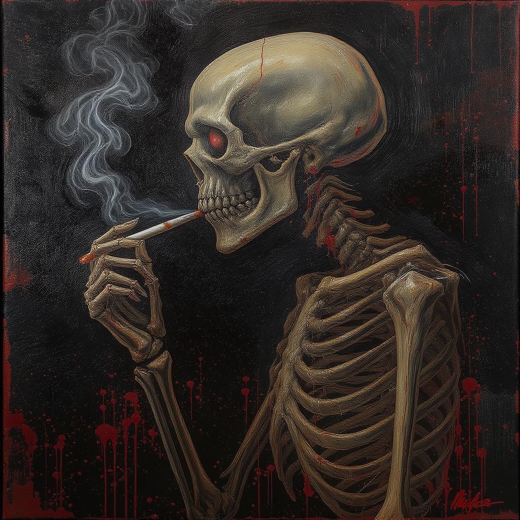 Acrylic painting featuring splatter and drip techniques, a portrait of a skeleton smoking, shown in side view. The composition is epic and gloomy, with a dramatic and emotionally profound expressionist style. This digital painting, inspired by Tanya Shatseva, captures a close-up view that conveys a sense of morbidity and mutation. The skeleton is depicted with exaggerated features and distorted anatomy, such as a long neck and unsettling proportions, creating a haunting, deformed appearance. The piece includes elements of blurriness and artifact-like textures, resembling jpeg compression, and conveys a sense of eerie duplication and deformity. The skeletal figure is marked by missing and extra limbs, with malformed and gross proportions, while the background is subtly textured with indications of a signature or watermark that blends into the artwork.
