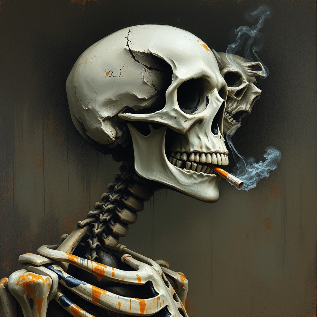 Acrylic painting, splatter and drip technique, portrait of a smoking skeleton in profile, moody and epic composition, dramatic and digital, expressionism, emotionally intense, close up, inspired by Tanya Shatseva, distorted text, worst quality, low resolution, jpeg artifacts, unattractive, redundant, eerie, disfigured, hazy, dry, incorrect anatomy, awkward proportions, extra limbs, duplicated face, unsettling proportions, misshapen limbs, missing appendages, elongated neck, unintended camera marks, obscured name, signature, watermark, logo, disjointed, bad alignment, irregular features, aberrations.