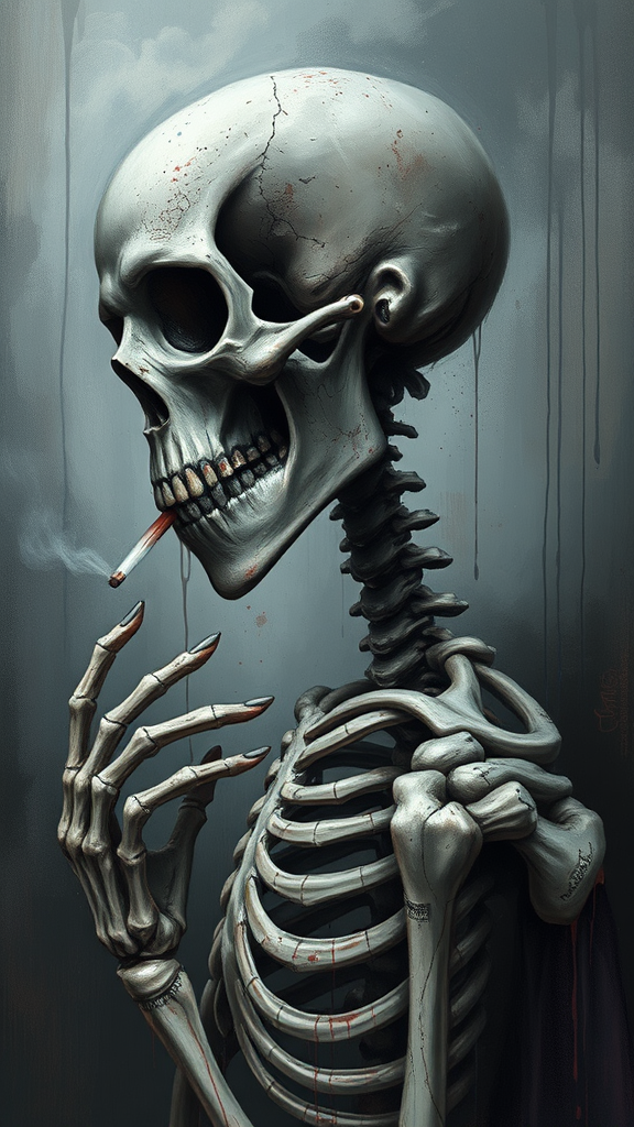 Acrylic painting with a focus on splatter and drip techniques depicts a side-view portrait of a smoking skeleton, infused with a gloomy and epic composition that captures dramatic expressionism. The scene is emotionally profound and designed as a close-up digital painting inspired by the style of Tanya Shatseva. The artwork embodies a sense of morbid beauty, though it exhibits intentionally distorted and whimsical elements such as poorly defined hands, a mutated face, and exaggerated features. The anatomy and proportions are whimsically and intentionally skewed, showing traits like malformed limbs, extra or missing arms and legs, and a disproportionately long neck. Textures emulate low-quality jpeg artifacts, creating an aesthetic reminiscent of an old, worn photograph. The composition bears various artistic marks like watermarks, signatures, and logos, lending a sense of imperfection and rawness to the piece.