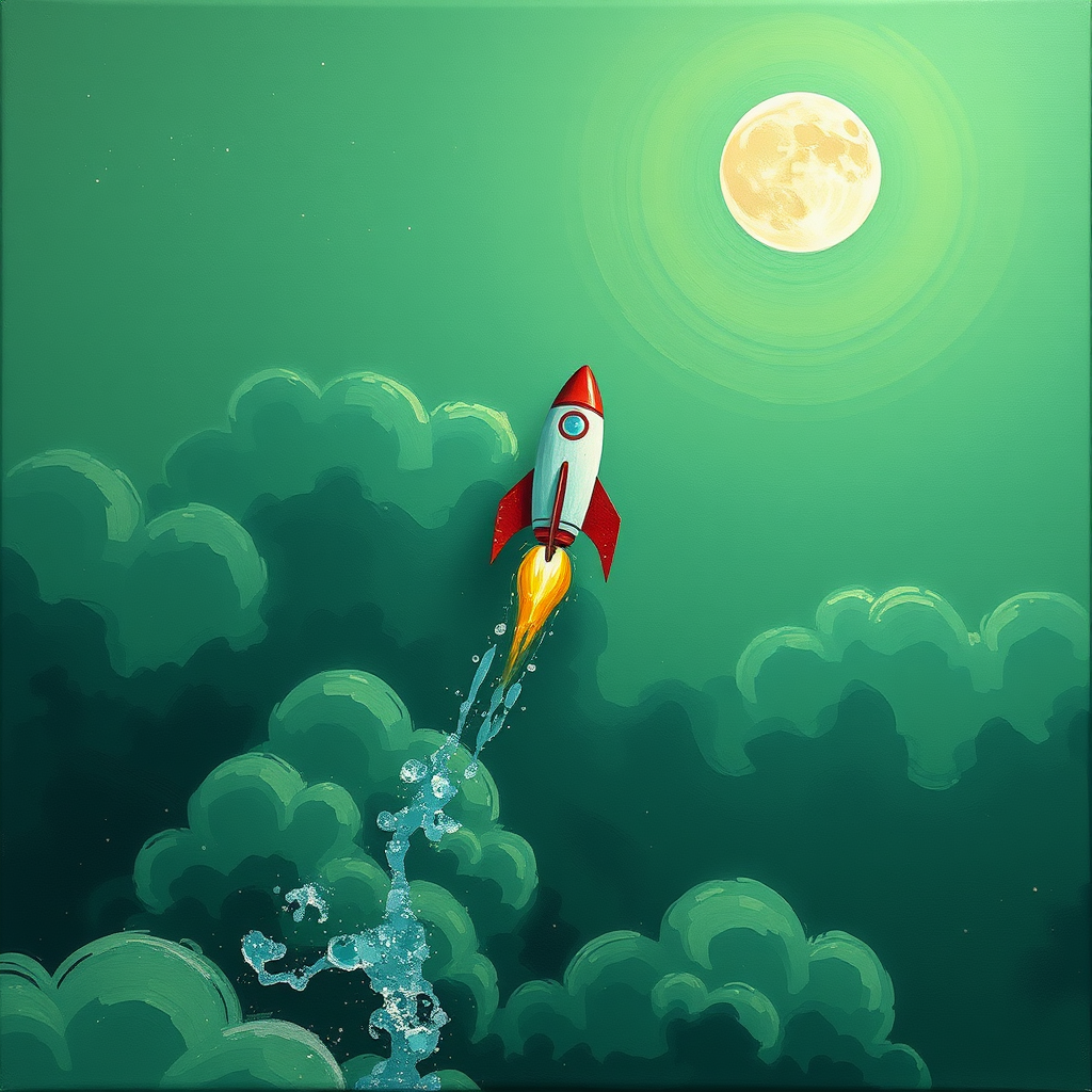 Acrylic palette knife painting of a rocket soaring through green-tinted clouds and heading into the vastness of space, aiming towards the moon, capturing the whimsical style of Laurie Greasley and James Gilleard with a touch of Genshin Impact. The scene is minimalistic, utilizing a few harmonious colors and showcasing a minimalist background. The artwork evokes the texture of traditional acrylic artwork, highlighting a low-detail aesthetic. Rendered in 8k, UHD, HDR with a focus on a clean appearance, avoiding low resolution issues and maintaining attention to clarity and focus. Noteworthy on platforms like DeviantArt and ArtStation with no obvious digital artifacts or distractions, ensuring a seamless visual experience.
