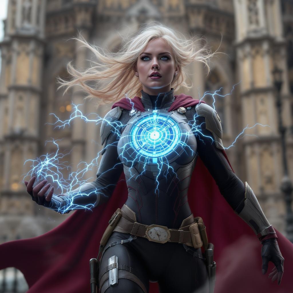Action-packed full-length photograph of a realistic British heroine, a master of time manipulation. She wields her Chronal Accelerator, a central circular device adorned on her chest. The device displays intricate circuitry and pulsates with vibrant blue energy, granting her the extraordinary ability to blink through moments, recall past actions, and deftly manipulate the flow of time. However, amidst the chaos, her pose appears with slightly distorted anatomy and blurry limbs, capturing the dynamic motion and intensity of her time-bending exploits.