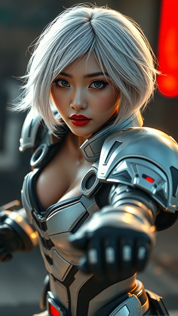 Action-packed scene featuring a stunning Korean woman resembling a K-pop idol, donning sleek Mass Effect-inspired armor. Her white hair is styled in a cute loose bob, complementing her striking red lips. With a toned physique and small breasts, she is captured in a dynamic pose that showcases her agility and strength. Dramatic lighting enhances the scene, highlighting the intricate details of the armor and her expressive features. The image is rendered in ultra-high resolution with physics-based techniques, adding realism and intensity to the composition.