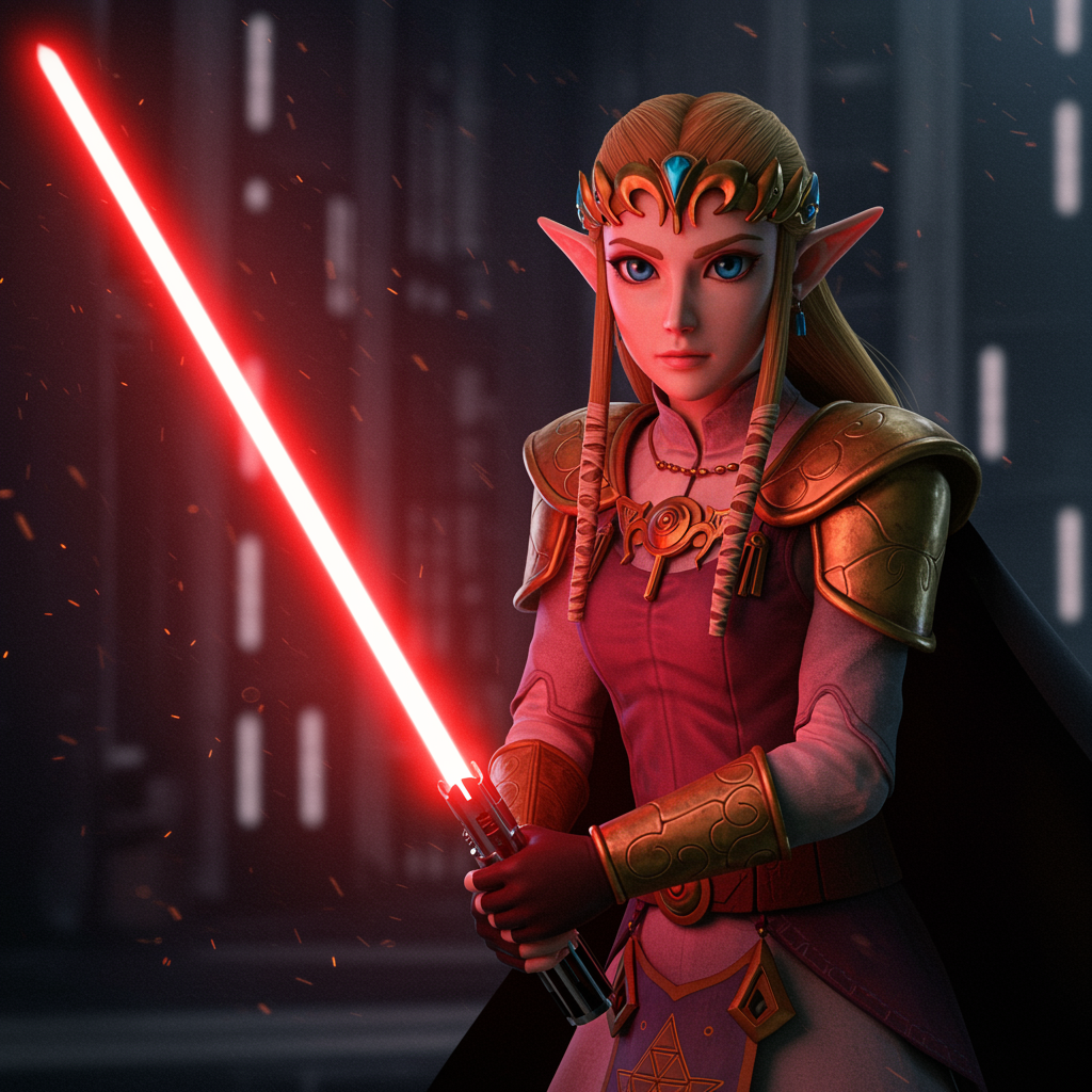View this AI-generated image featuring action packed scene of princess zelda transformed into a character resembling darth vader wielding a red lightsaber with a focus on symmetrical eyes the lighting is dramatic enhancing the realistic portrayal with sharp focus and high definition quality the imag