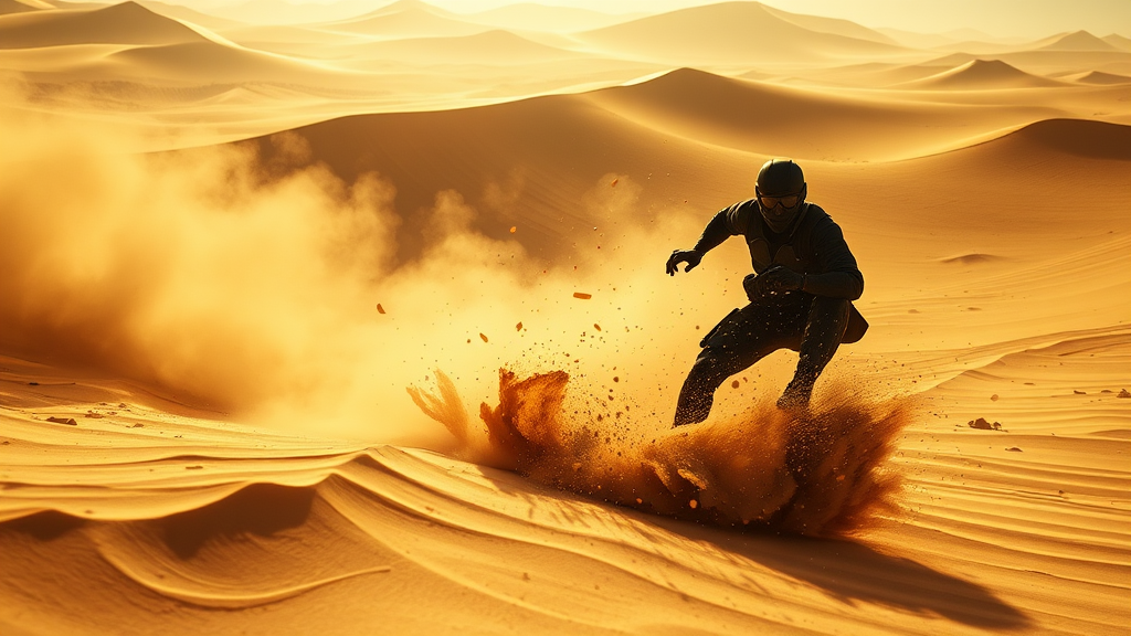 Action scene in a desert landscape, featuring an immersive background with volumetric sand and global illumination. The intense, dramatic lighting casts bold shadows across the scene, highlighting the gritty palette and muted colors. This highly detailed digital artwork is rendered in ultra-high resolution, utilizing physically-based rendering to achieve a realistic yet stylized aesthetic. The scene is captured through an f2.0 lens, creating a shallow depth of field that enhances the focus on the central action. Amidst the swirling sand, an unexpected twist unfolds, adding intrigue to the narrative.