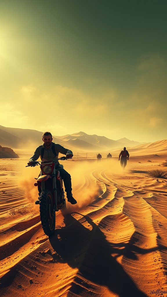Action scene in a desert landscape with an immersive background, featuring volumetric sand and global illumination. The intense and dramatic lighting casts deep shadows, enhancing the scene's realism. A high-detail digital painting, rendered with ultra-high resolution, combines realistic elements with a stylized approach. The artwork's gritty palette and muted colors are captured using an f2.0 lens, creating a physically-based rendering that feels tangible and vivid. An unexpected twist adds intrigue, making the scene not only realistic but also unique and captivating.